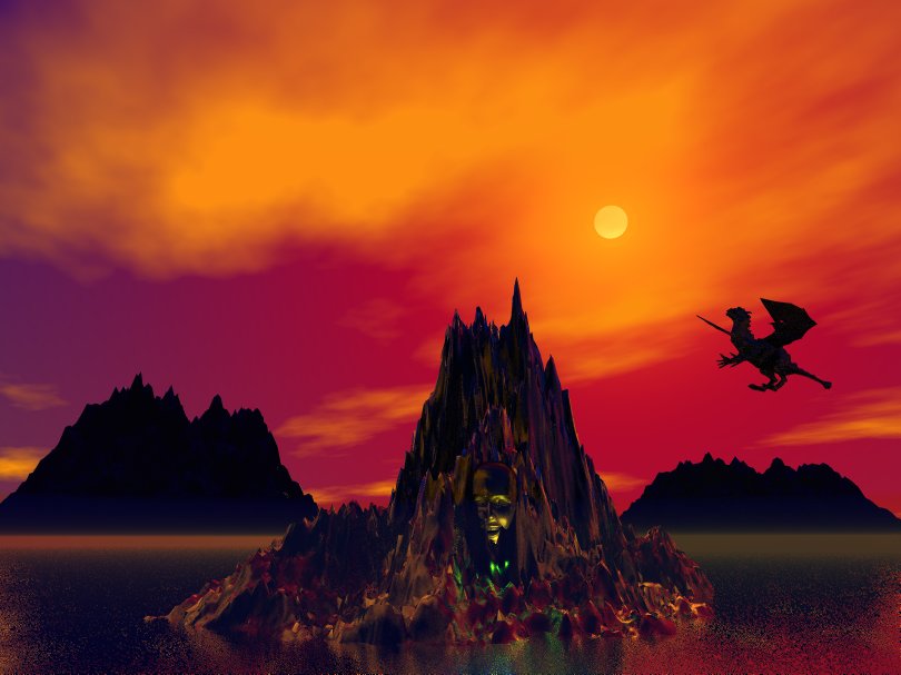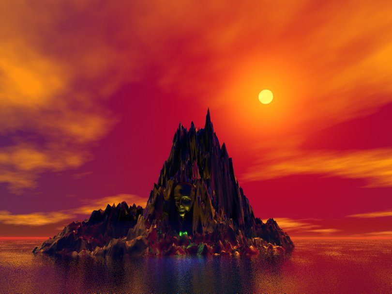Ob du nun noch ein paar weitere Objekte platzierst (Land am Horizont oder so) liegt bei dir. Ich könnte mir so 'n kleines Schiffchen (Eingeborenenkanu - ) im Hintergrund vorstellen, in dem ein paar Eingeborene zur Insel rudern um ihre Opfergaben hin zu bringen.
