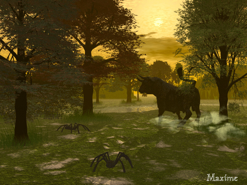 • Hmmmm - Das Terrain ein wenig runder - 'ne Spinne auf des Stieres Rücken, der versucht sie abzuschütteln - mehr so eklige 8-Beiner - ... ;)