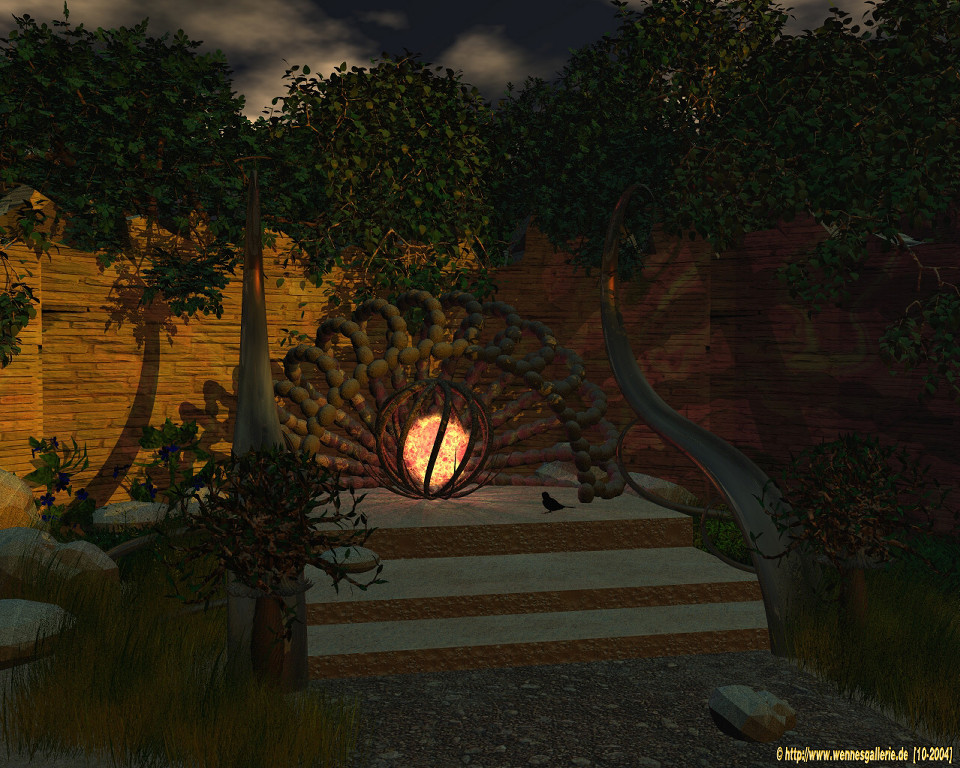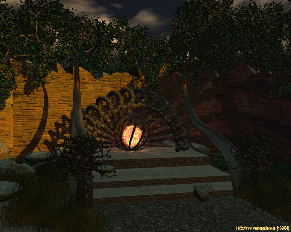 Das Problem Stein ist mir auch erst nach dem Fertigrendern aufgefallen. Eigentlich soll er ja, laut dem Wireframe, an der untersten Stufe lehnen. Aber das kommt wegen der, genau in diesem Bereich, fehlenden Schatten nicht sehr gut raus. es wäre wohl besser gewesen, ich hätte ihn weggelassen oder etwas weiter vorne auf den Weg gelegt.