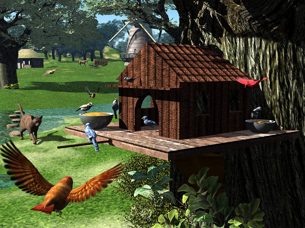 Das Vogelhaus könnte ich mir mit anderer Textur besser vorstellen. Vor allem das Dach!