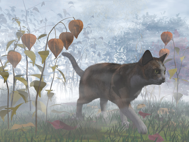 Die Katze ist aus Poser (mit Version 5 funktioniert der Turbo Importer von DAZ besser), die Pflanzen sind aus X-frog, die Lampionblumen hab ich in Curvy erstellt (hab ich ganz neu, bin noch im Experimentierstadium). Die Hintergrundbäume sind Bryce-Standard.