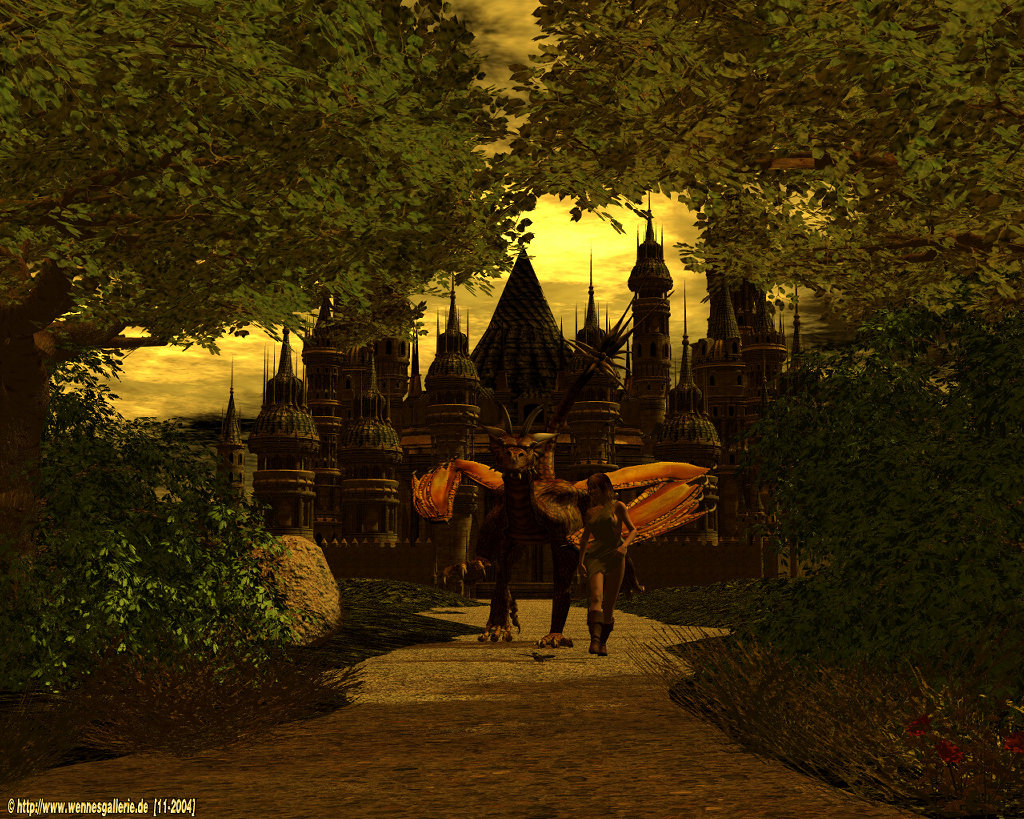 Hab mal wieder mit dem Millennium-Drachen rumprobiert. Da sein Tempel ja jetzt kaputt ist, hat er bei einer freundlichen Dame in ihrem Schloss Unterschlupf gefunden. ![]()