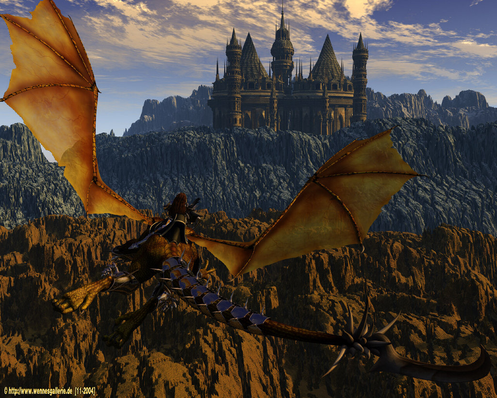 Wie bisher: Millennium-Drache, diesmal mit Sattel und Rüstung, von Poser. Ne Vicky auf den Sattel gesetzt und ihr auch 'ne Rüstung angezogen. Dann die Burg mit Kaols-Castle-Creator gebastelt und das ganze dann in Vue in Szene gesetzt und gerendert.
