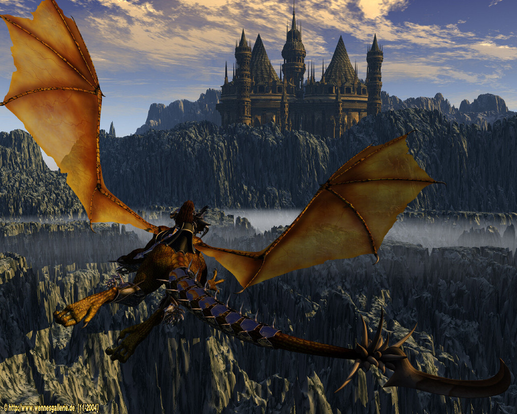 Wie bisher: Millennium-Drache, diesmal mit Sattel und Rüstung, von Poser. Ne Vicky auf den Sattel gesetzt und ihr auch 'ne Rüstung angezogen. Dann die Burg mit Kaols-Castle-Creator gebastelt und das ganze dann in Vue in Szene gesetzt und gerendert.