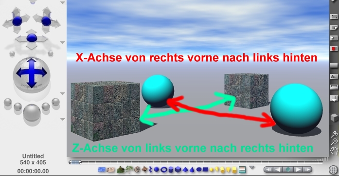 Auf der X-Achse bewegen sich Objekte von rechts vorne nach links hinten (auf dem Bild die Kugeln),