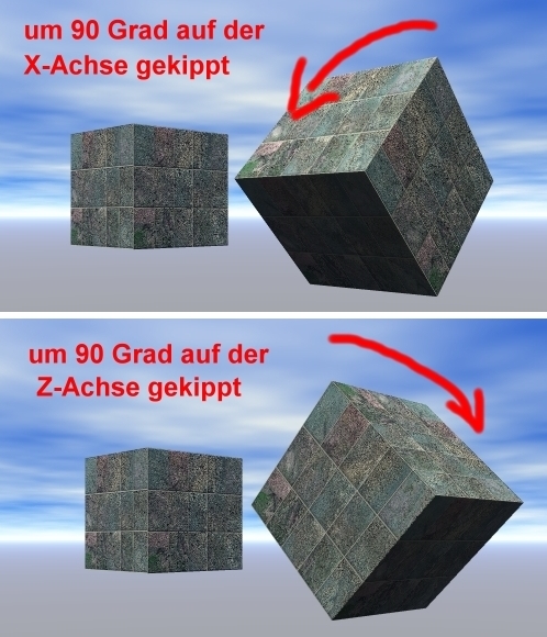 • Hier ist noch einer, damit die Sache mit der Rotation klarer wird. Du schaust einfach, wie beim Rotationswerkzeug in der Menüleiste die Ringe drumherumlaufen; in genau diese Richtung wird dann auch ein Objekt gekippt, wenn du es anwendest.