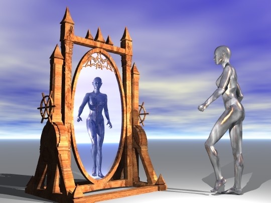(2 Spiegel gegenüber mit Objekt dazwischen)