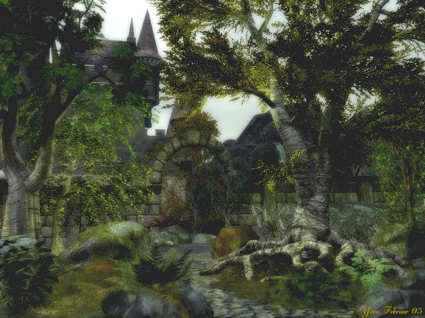 Burg und Mauer sind Freestuff-Objekte, die Bäume habe ich mit Onyxtree erstellt. Die knorrige Wurzel ist eines meiner Anfängermodelle mit ZBrush.