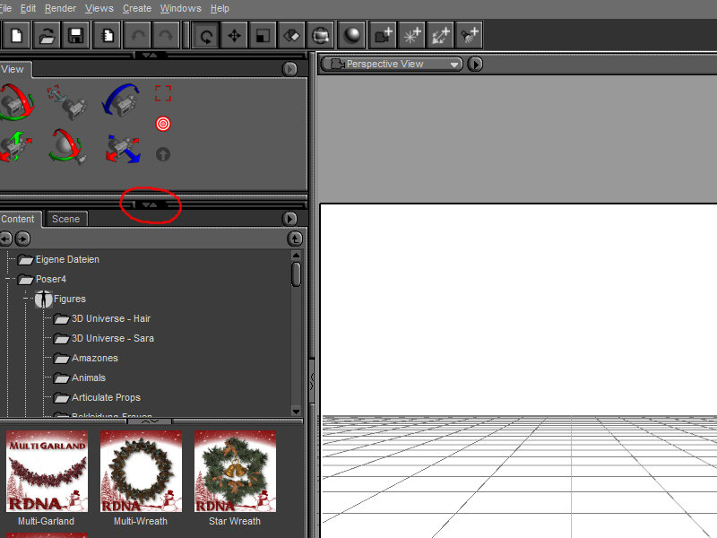 hast du ev. auf die rot eingekreisten Pfeile geklickt? WEnn ja, dann schau mal unten am Bildrand, da sind die Pfeile wieder, einfach draufklicken, dann sind SZene und Content wieder unter den Kamerabildchen.