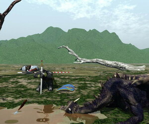 Was mir an der ganzen Sache nur nicht sooo gut gefällt ist die Textur des Berges im Hintergrund und die Tatsache, daß der umgestürzte Baum im letzten Bild so gerade abgeschnitten ist. Den würde ich etwas mehr aufstellen und dafür das Ende mehr in den Boden versenken.