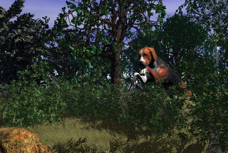 Vielleicht könntest du bei dem Baum gleich neben dem Hund die Blätter kleiner machen und das Glanzlicht reduzieren? Die sehen nämlich ein bisschen künstlich aus. Und der Stein links vorne könnte etwas mehr Relief vertragen.