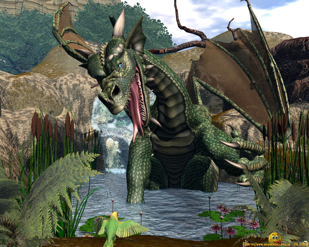 Die Badewanne (PondLife - in Vue umtexturiert), der Drachen, der Vogel und das Schilf sind aus Poser. Farne, Bäume und Berge im Hintergrund sind von Vue5 - ebenso das Licht und so.
