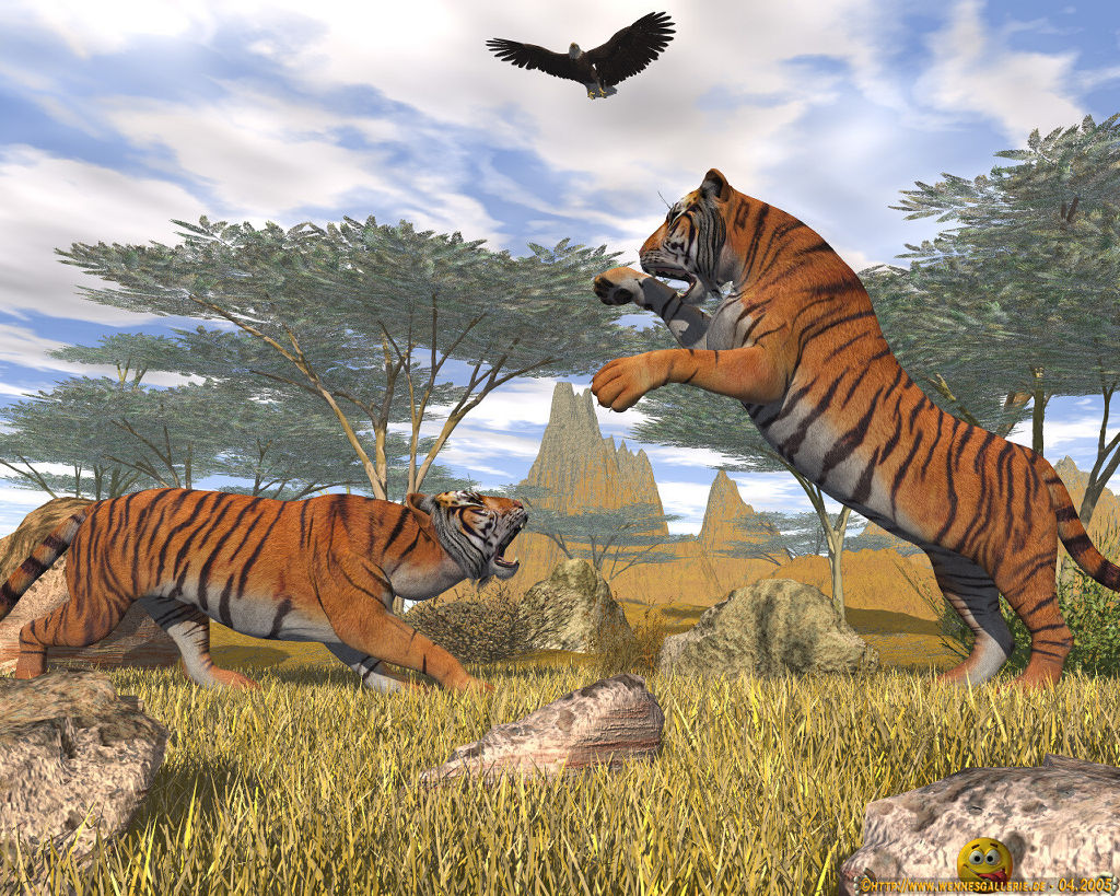 Die Tiger, die sich da um ihr Revier streiten, sind von den MillenniumBigCats von DAZ. Der Adler da oben ist auch von DAZ. Der Rest der Szene ist alles Vue5.