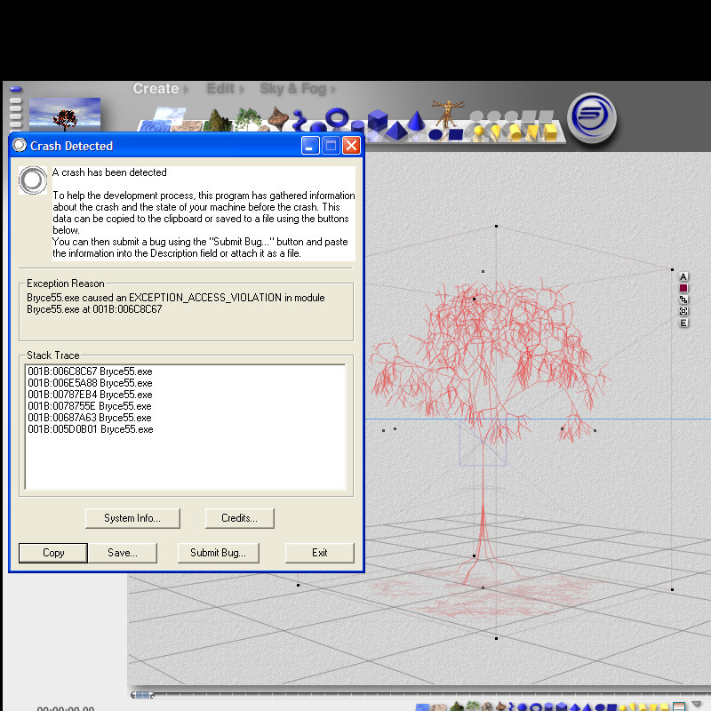 ...egal was ich mit dem Baumeditor in Bryce 5.5 mache, ich bekomme solche nette Fensterchen und Bryce 5.5 schließt