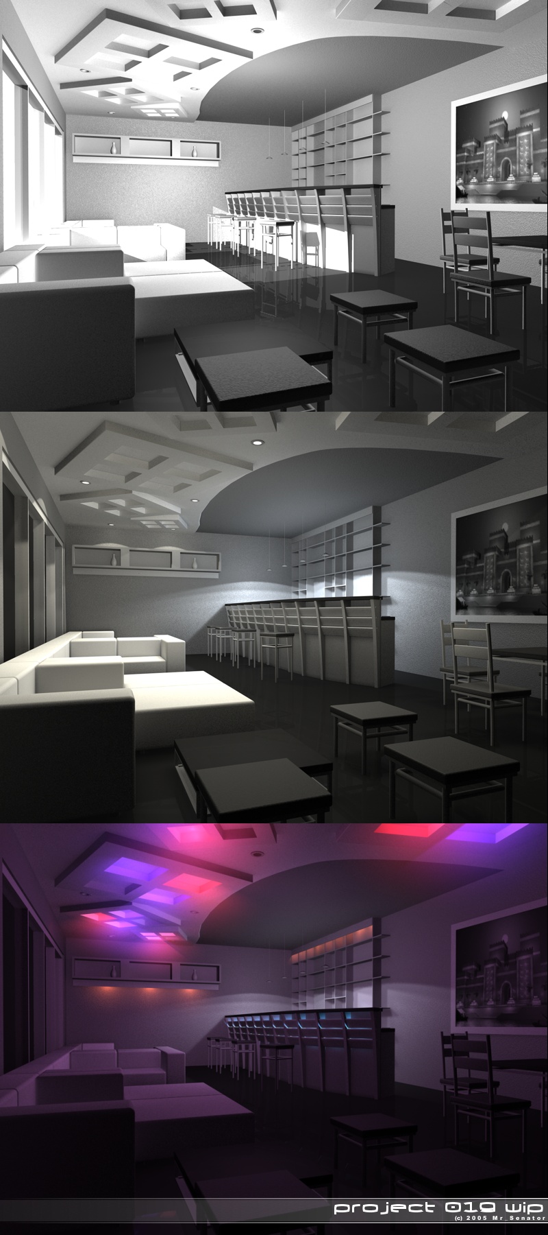 aufgabenstellung war diesmal eine bar zu modellieren und in 3 lichtstimmungen zu rendern: Tageslicht, künstliche Beleuchtung und farbige Lichtquellen; keine Texturen bzw. nur einfache graustufen.