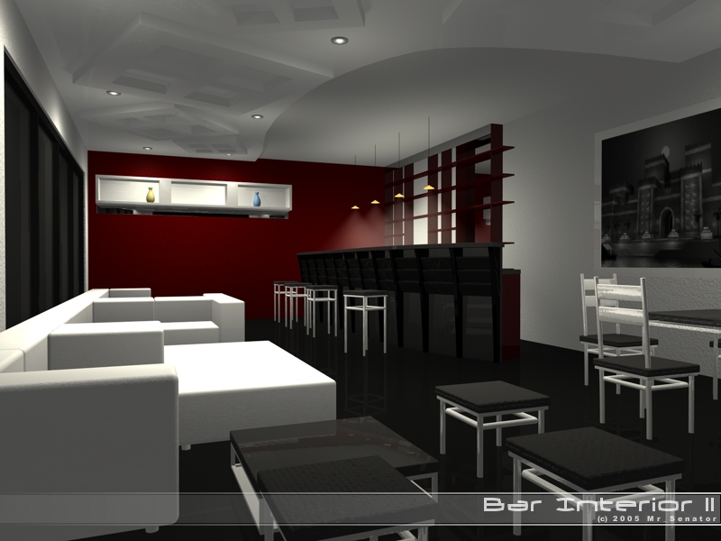 aufgabenstellung war diesmal eine bar zu modellieren und in 3 lichtstimmungen zu rendern: Tageslicht, künstliche Beleuchtung und farbige Lichtquellen; keine Texturen bzw. nur einfache graustufen.