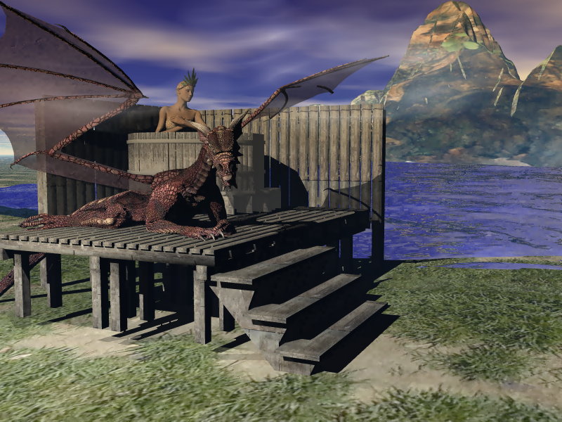 Vielleicht kannst du das ganze Badehaus mehr nach rechts vorne ziehen?Dann ist der Drachen und sein Schützling noch besser zu sehen und der Berg im Hintergrund wird mehr verdeckt. Das Badehaus mit Inhalt ist super gelungen. ![]()