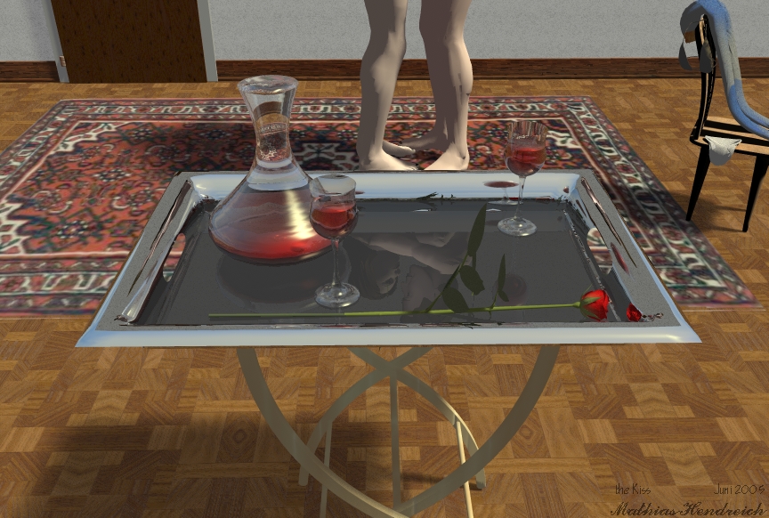 Das Tischchen finde ich sehr nett. Gläser und Karaffe sind sauber mit Wein gefüllt. Die Materialien stimmen auch bis auf die bereits erwähnte Haut. Versuche mal die Haut mit ein wenig Bump zu belegen und etwas breit gestreutes Glanzlicht dazuzugeben ;).