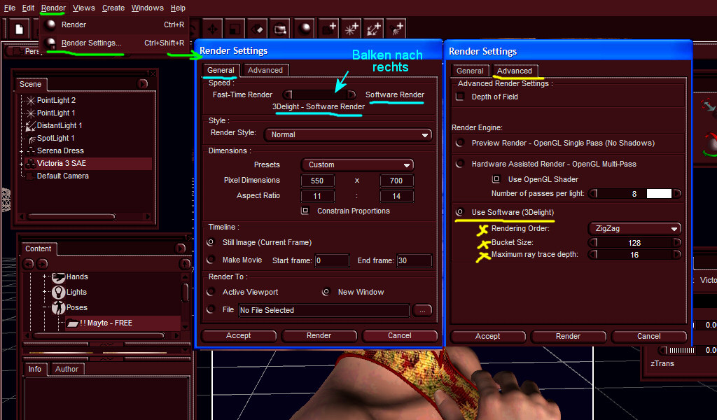 Statt mit Poser habe ich die Lady komplett mit DAZ-Studio erstellt und gerendert. Gegenüber Poser 4 gibt es im DAZ-Studio bei den vorgefertigten Posen usw. ein paar wenige Sachen die minimal abweichen. Aber ist weiter kein Problem das nachzubessern. Bei der Beleuchtung habe ich noch nicht den richtigen Dreh raus....