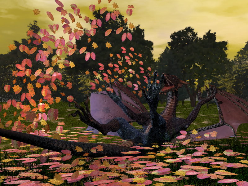 Genau wie ich es früher geliebt habe, einen großen Blätterhaufen durcheinanderzubringen, findet der junge Drache ebenfalls Gefallen daran. Er quietscht vor Vergnügen und rollt sich auf der Wiese hin und her.