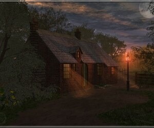 Am Haus vorbei zw. den Zaunelementen hindurch geht ein Weg - der hätte noch nach hinten hin ein paar Laternen bekommen (womit es vielleicht auch für Rendermans Monitor hell genug gewesen wäre :hat2 ). Aus einem (dem vorderen) Schornstein sollte noch Rauch kommen. Vor dem ersten Fenster war eine Gartenbank geplant.