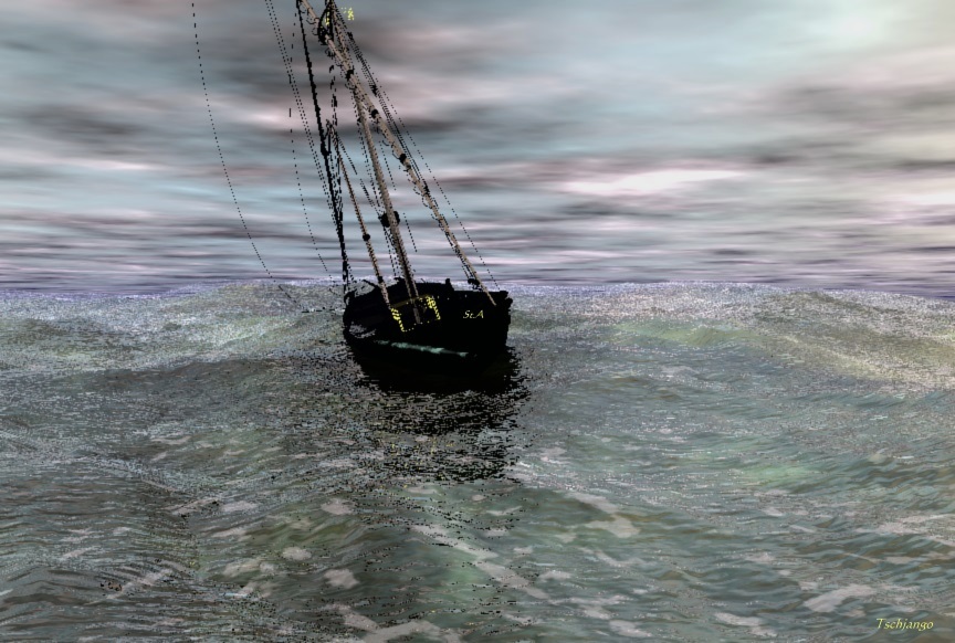 Schade finde ich nur, dass man das Schiff hauptsächlich schwarz sieht. Da solltest du noch ein bisschen mit den Texturen spielen (Umgebungslicht und so). Es wirkt wie ein Fremdkörper, so schwarz mitten in den transparenten Farbtönen...