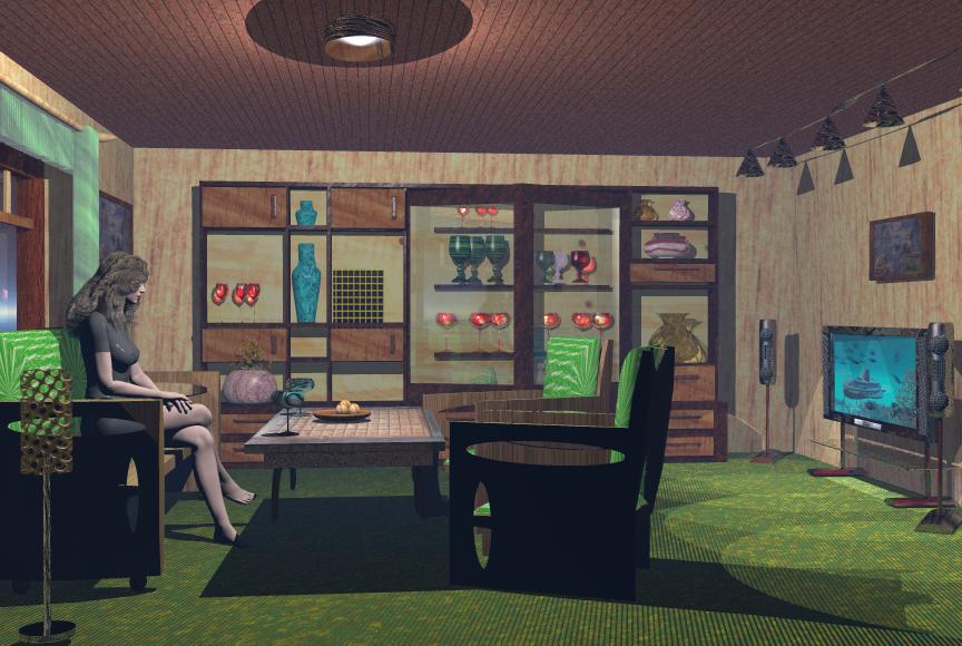 Was mir auffällt und was Du verbessern solltest( und auch kannst) : Einige der Dekosachen im Schrank schweben über der Trägerplatte. Ist deutlich zu sehen. Das Kleid der Dame glänzt im Brustbereich. Da muß im Mateditor mit der Bump gearbeitet werden. In meinen Augen ist die Dame außerdem zu groß skaliert.