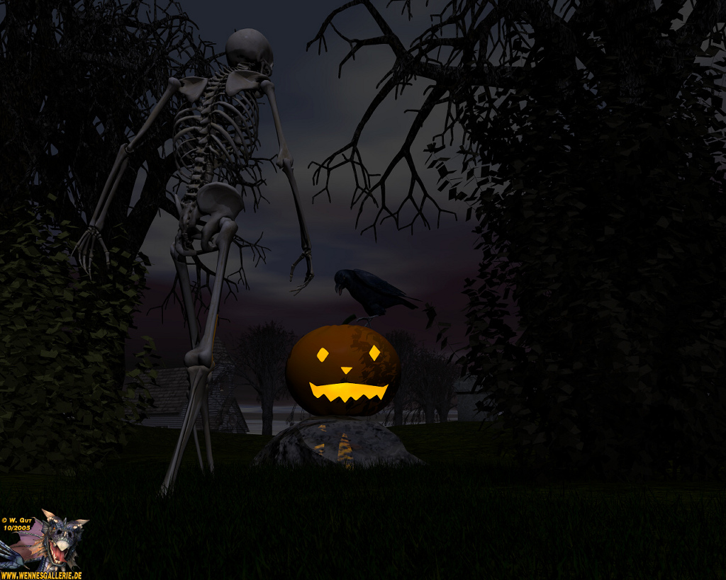 Den Kürbis habe ich in Cinema4D gebastelt und dann mit Bryce texturiert und beleuchtet. Das Skelett ist von DAZ und der Rabe auch. Beides in Poser geposed und dann übers DAZ-Studio nach Bryce5.5 gebracht.