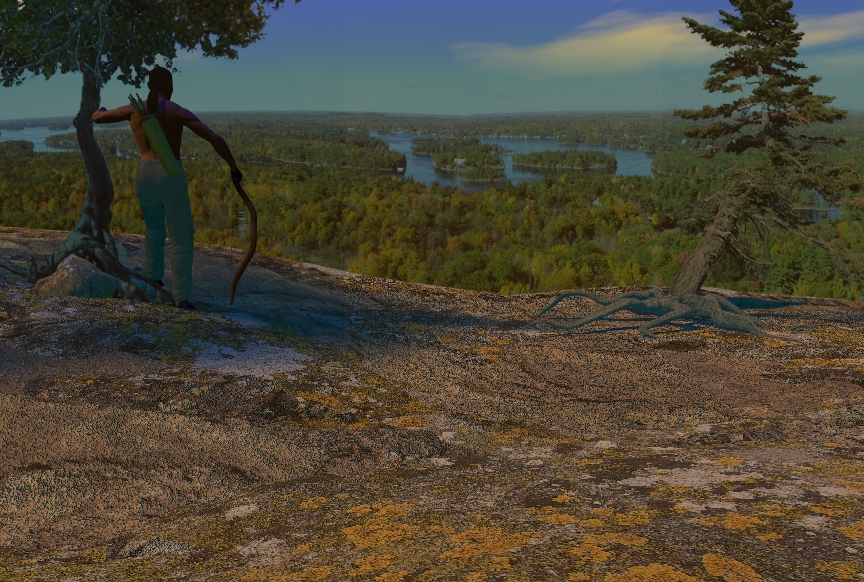 Der Hintergrund ist eine Panoramaaufnahme bestehend aus 3 Bildern die ich bei den thousand Island in Canada aufgenommen habe. Der Felsen im Vordergrund besteht aus 4 verschiedenen Texturen. Die Figur ist in DAZ Studio gemacht. Pfeil und Bogen (ich hoffe man erkennt es als solche 8)) habe ich in Cinema zusammengebastelt. Durch die Verwendung von weichen Schatten und volumetrischen Licht habe ich die Renderzeit auf über 12 Stunden hochgetrieben. :mua