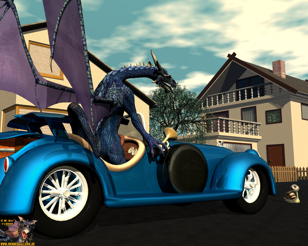 Das Bild ist in Bryce5.5 gerendert - Drache, Auto und Schnecke sind von DAZ für Poser - die Häuser hab ich schon vor längerer Zeit in C4D gemodelt.