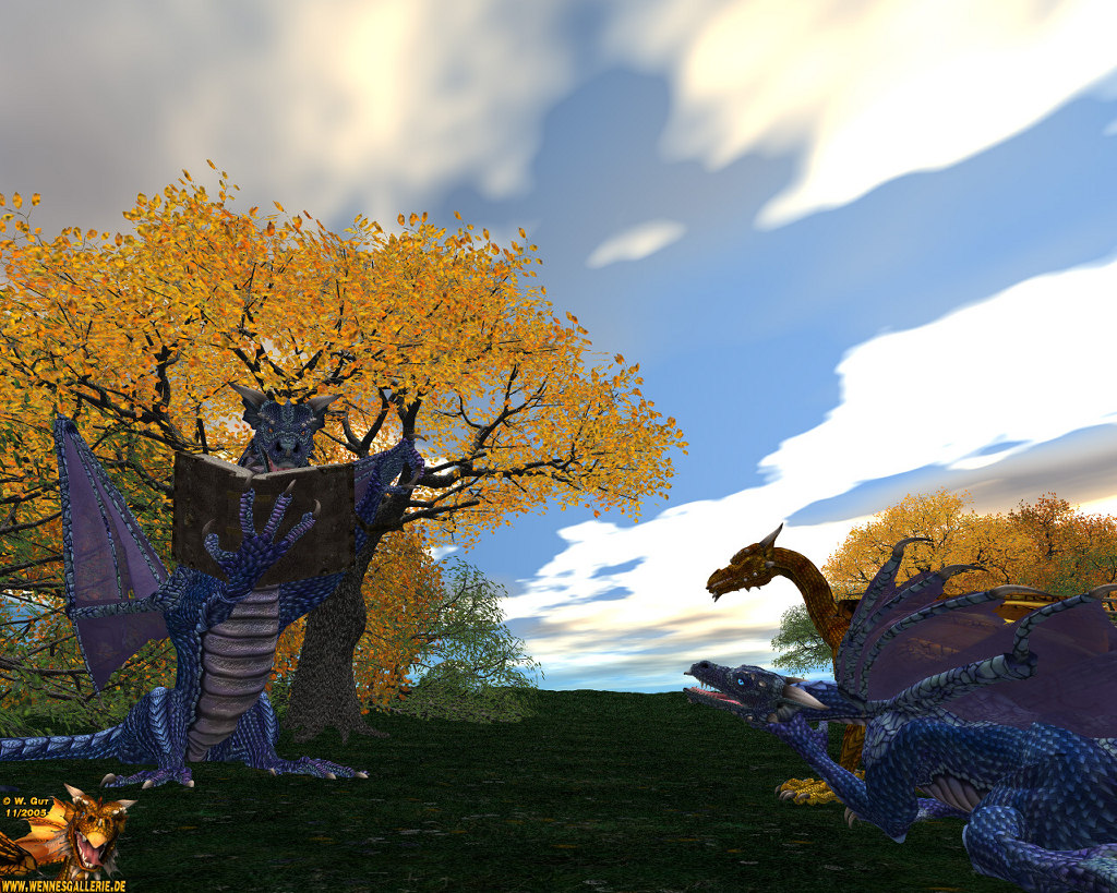 Zwei Bilder die mit Vue5Esprit entstanden sind. Zuerst war nur der lesende Drache da, als ich mich entschloss noch etwas aussenrum zu basteln.