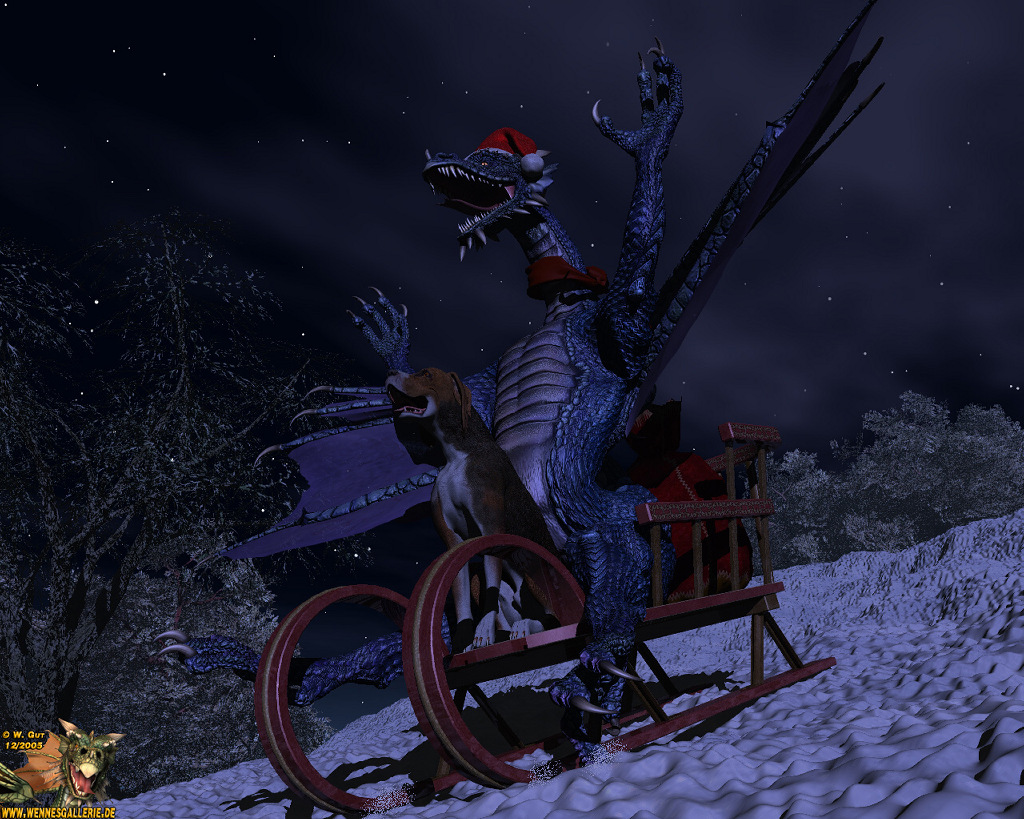 auch wenn ich mich wiederhole. Der Drache ist auch mein Liebling. Man kann soooooo schöne Bildchen machen. Die Idee ist einfach köstlich, vor allem mit dem Dog auf dem Schlitten. Echte Sahne.