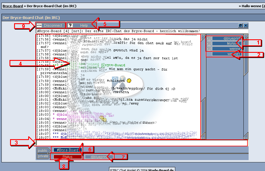 Der Bryce-Board-Chat ist ein IRC-Chat. Über das Board könnt ihr mittels eines Java-Applets am Chat teilnehmen. Dabei werdet ihr automatisch mit eurem Usernamen eingeloggt. Damit das funktioniert solltet ihr die neueste Java-Version installiert haben. Diese könnt ihr kostenlos hier bekommen: http://www.java.com/de/