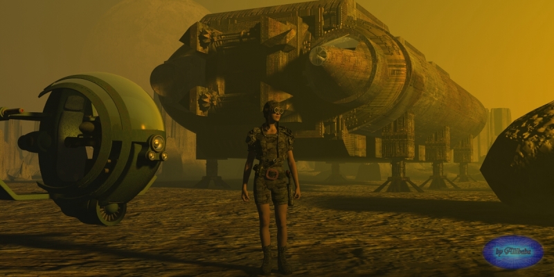 Hier mal wieder ein Science Fictionbild von mir. Das Raumschiff im Hintergrund ist zu 95 % aus BrycePrimitives.
