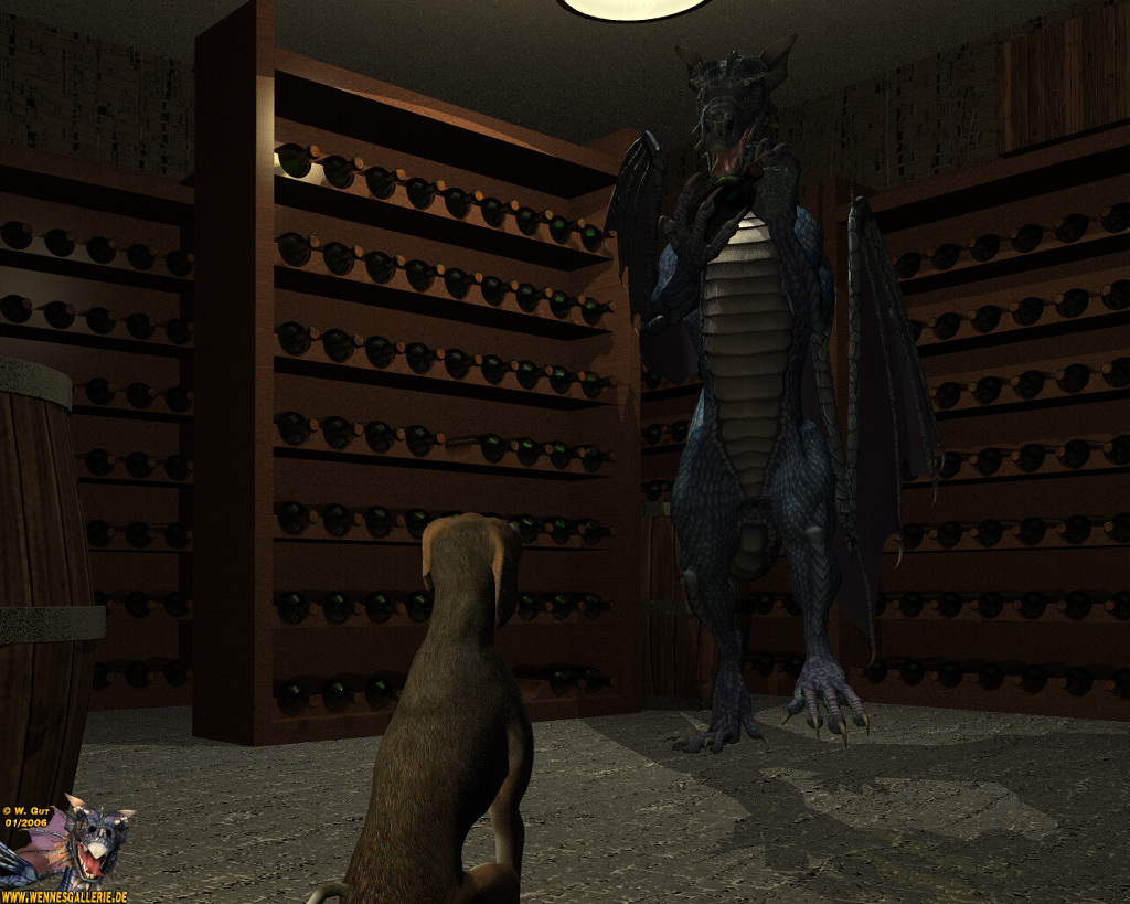 Das Bild ist mit Cinema4D (Flaschen, Regale, Fässer und die Lampe oben, von der man aber nicht mehr viel sieht :p030:), Poser5 (Drache und Hund) und Bryce5.5 (Texturen, Szene und Licht) entstanden.