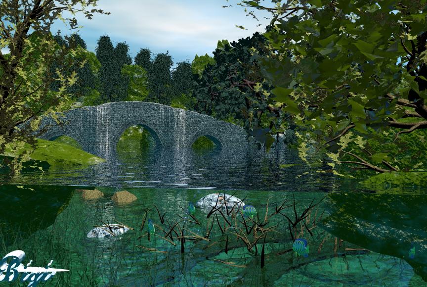 Die Bäume im Vordergrund gefallen mir gut wie auch der ganze Bildaufbau mit der Brücke. Die Steintextur der Brücke sieht top aus! Würde die Felsentextur, besonders der vordere linke, auch etwas verändern. Auch sehen mir persönlich die Felsen, speziell der vordere linke, zu scharfkantig aus. Was mir aber auf den ersten Blick aufgefallen ist war das dunkle "Grass", dat wirkt auf mich so als ob es ausm Wasser rauswächst, kann ja aber nicht aus dieser Perspektive, deswegen hat mich das auch irgendwie so richtig irritiert. Naja das mag aber auch wieder an der Betrachtungsweise liegen, denn jeder sieht ja so ein Bild irgendwie anders. Vielleicht liegts auch an den Farben.