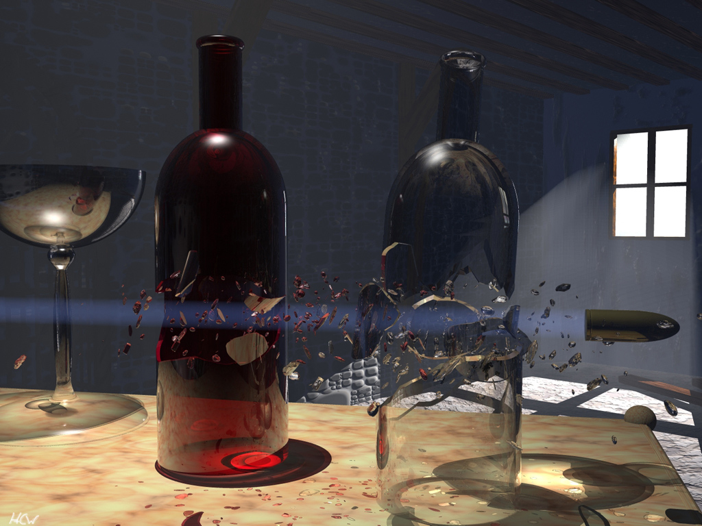 hmmmmm - ich finde das schon mal sehr gut gelungen! Die Scherben find ich gut, würde sie aber mehr in Flugrichtung der Kugel fliegen lassen. Vieleicht auch die Flaschen ein wenig in die Richtung neigen, da die Kugel, bevor sie in das Glas eindringt erst mal die Flasche ein wenig anstuppst. ![]()