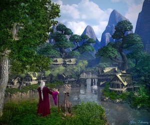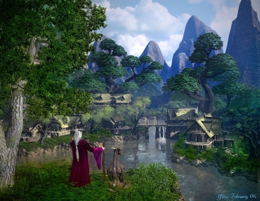 Die Elbenhäuser von Chikako gibts im 'Rosity Marketplace; die beiden hinteren großen Bäume sind Freestuff auch von dort. Zusammengebaut und gerendert wurde alles in Bryce, allerdings liegt da noch ne Wagenladung Postwork drauf.