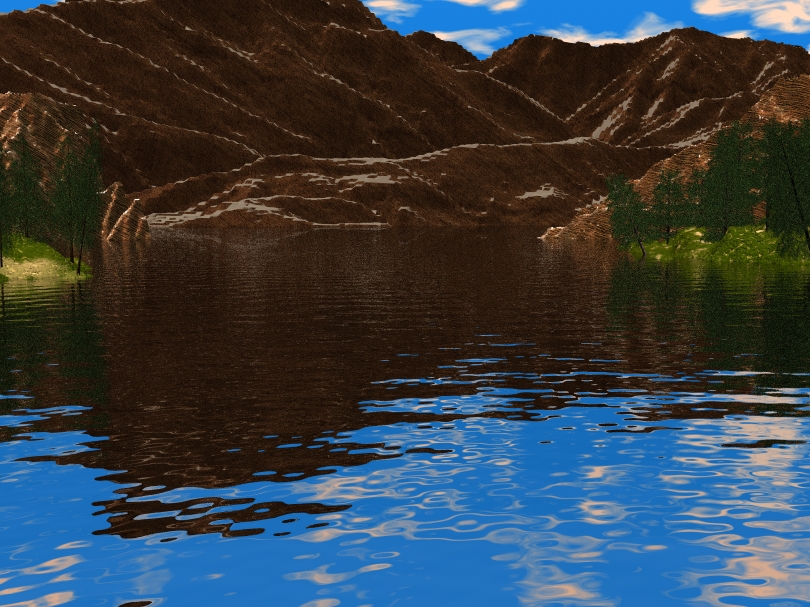 Also: Das Wasser erscheint mir ein wenig zu blau. Eventuell würde es mit mehr Transparenz besser aussehen. Was mir noch aufgefallen ist, das ist der harte Schnitt zwischen den Texturen des Berges und des Bodens auf dem die Bäume stehen. Die Berge sehen aus als ob Schnee auf den ebenen Flächen liegt während der Boden unter den Bäumen saftig grün ist. Und eine Frage zu den Bäumen. Sind das 2D Bäume? Die sehen nämlich so flach aus. 3D Bäume würden sich besser aussehen.