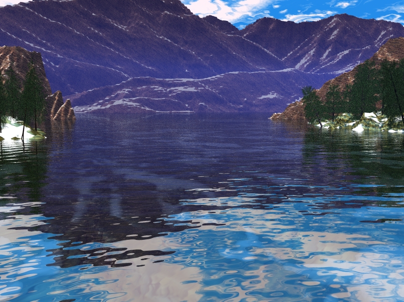Also: Das Wasser erscheint mir ein wenig zu blau. Eventuell würde es mit mehr Transparenz besser aussehen. Was mir noch aufgefallen ist, das ist der harte Schnitt zwischen den Texturen des Berges und des Bodens auf dem die Bäume stehen. Die Berge sehen aus als ob Schnee auf den ebenen Flächen liegt während der Boden unter den Bäumen saftig grün ist. Und eine Frage zu den Bäumen. Sind das 2D Bäume? Die sehen nämlich so flach aus. 3D Bäume würden sich besser aussehen.