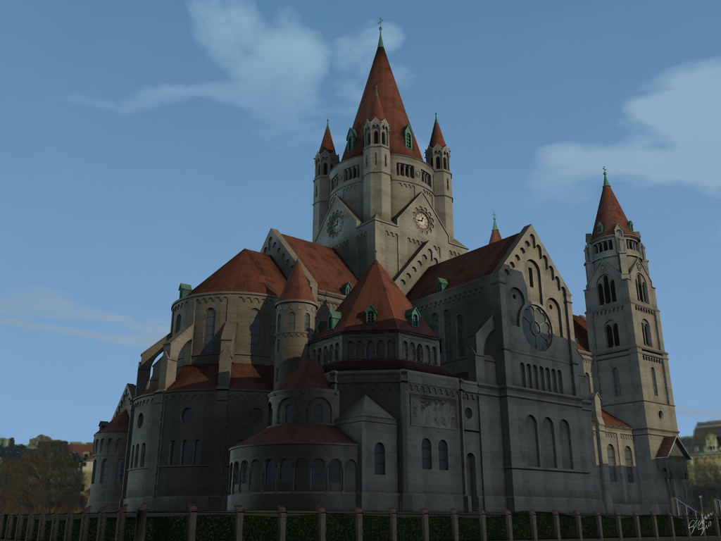 • die franz von assisi - kirche am mexikoplatz in wien. steht direkt bei der reichsbrücke an der donau; 1898 zum 50jährigen thronjubiläum von kaiser franz josef I. fertiggestellt.
