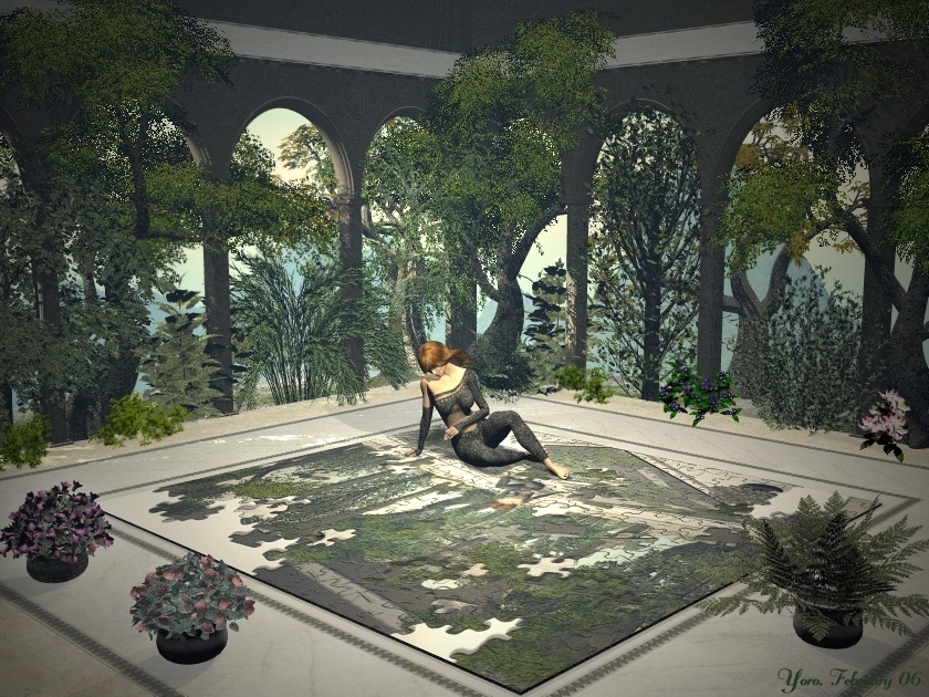 Auf der ersten Puzzleebene ist noch kein Puzzle sondern halt die weiße Fläche in der Mitte. Als jpeg abgespeichert, Filter drauf, das jetzt gepuzzelte Bild wieder gespeichert, Bryce Datei wieder geöffnet, auf die weiße Fläche in der Mitte ein gaaanz flacher Quader plaziert, darauf das Puzzlebild als Tex draufgelegt und gerendert.