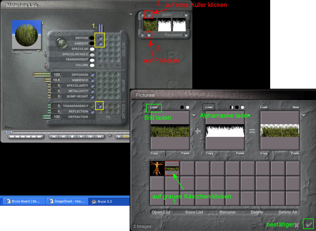 Dann klickst du auf das M neben der markierten Fläche. Nun bist du im Mat-editor und setzt hier im Schacht A eine lila Kugel in Duffuses, Ambientes und unten Transparenz. Klickst an dem Fenster oben rechts auf das P oder B in der deutschen Version und bist dann im Bildeditor. Hier klickst du in ein graues Kästchen, dann oben links auf "load", dort lädst du das Bild rein, in der Mitte wieder auf Load gehen und dort lädst du die Alphamaske. Im 3. rechten Bild siehst du dann das Erbnis. Nun das ganze mit Häkchen bestatigen. (siehe Bild 1)