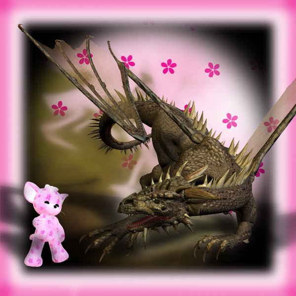 Gefällt mir. Rosa, bzw. pink wirkt auf mich immer schön kitschig. Auch wenn ich den Drache nicht gruselig finde (ich mag Drachen, sie sind einfach nur zu gross geraten, deshalb wirken sie bedrohlich) ist die Zusammenschau mit der kleinen Katze gut getroffen.