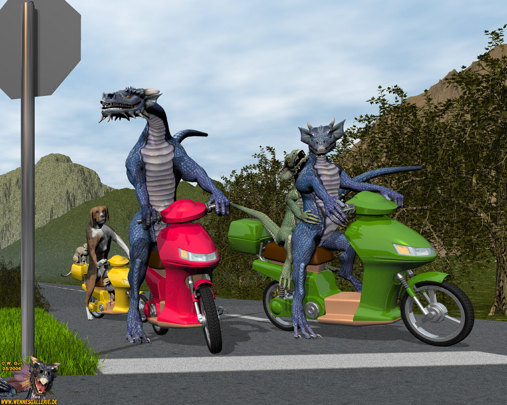 Mit beteiligt sind der MillenniumDragon2, der Dragonling, der Hatchling, der MillenniumDog und zwei Meerkats, alle auf drei Ebikes verteilt. Sämtliche Teile sind von DAZ für Poser.