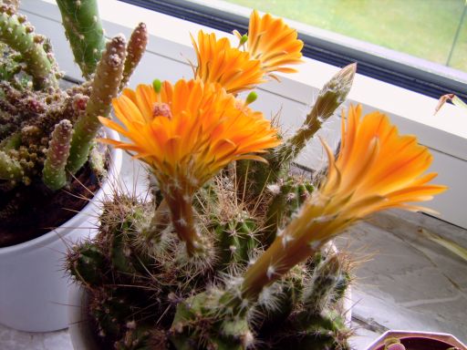 Ich hasse eigentlich Kakteen mit grossen Stacheln (eigentlich Dornen) da ich mal in einen grossen reingeflogen bin. Aber die Blüten gefallen mir schön kreftiges orange. Schön wäre es wenn der Hintergrund auch schön wäre