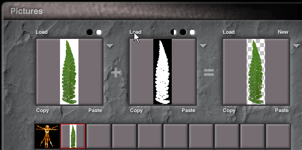 Bild 4: Dann klicke ich im mittleren Bild auf "Load" und lade die schwarzweiße Datei. Im Fensterchen daneben kannst du gleich das Ergebnis überprüfen. Du kannst mit dem halb-schwarz-halb-weißen Button die Transparenz auch umkehren.