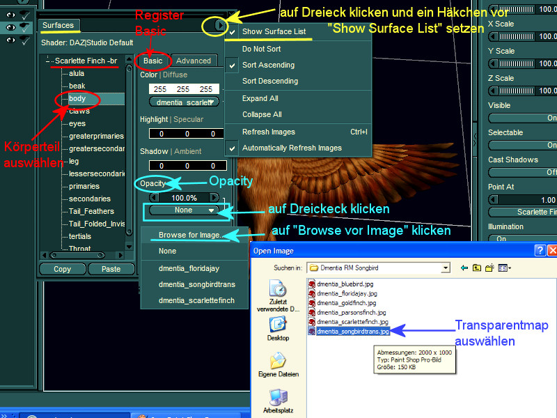 Bild 2: Surface-Fenster (das müsste an den Rändern größer gezogen werden, damit man die Optionen besser einsehen kann) ich habe rangeschrieben, wo was ist. Links das Körperteil auswählen. Rechts unter Basic dann die Textur ändern. Oben unter Color, da befindet sich noch mal ein Farbbalken, und unter dem Farbbalken ist die Textur geladen (.jpg) Unter "Opacity" wird dann die Transparentmap geladen.