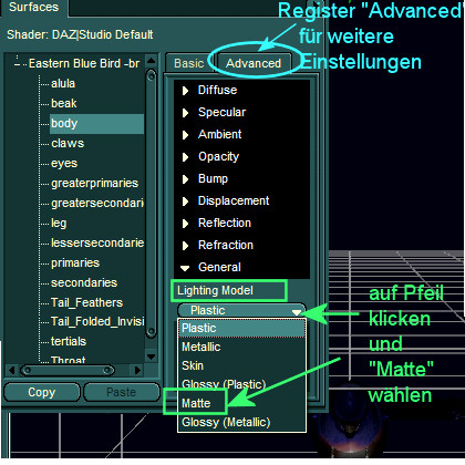 Bild 3: unter "Advanced" ist die Option "Lightning Model" auf Plastic gestellt. Bei Stoffen und z.B. auch den Federn ungünstig, da die Figur dann auch glänzt wie Plastic. Um das zu ändern, einfach auf das Dreieck neben Plastic klicken und aus der Liste "Matte" wählen