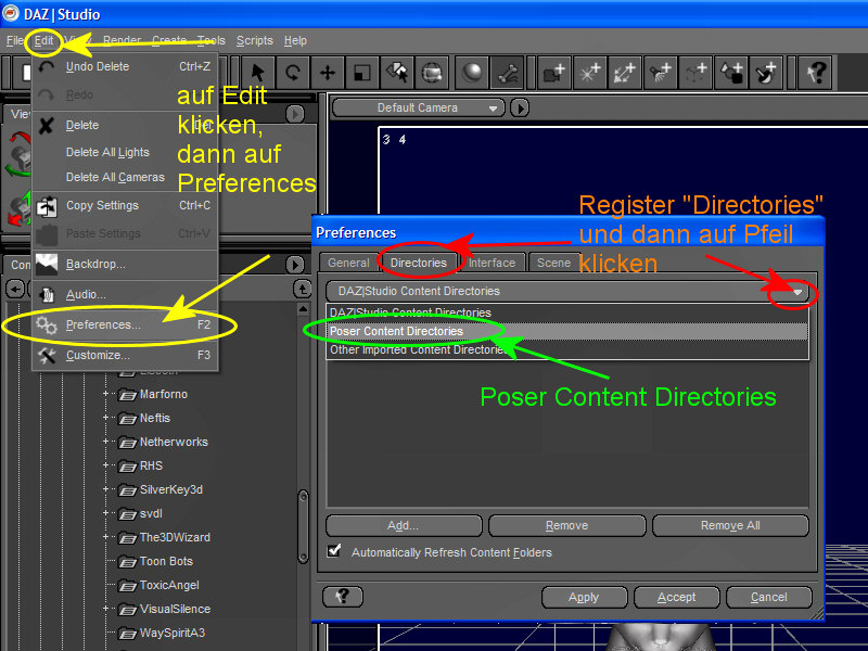 • Frage: Hast du unter Preferences die Poser-Content Directories vereinbart? Oder besser ausgedrückt dem DAZ-Studio gesagt, dass es mit dem Runtimeordner arbeiten soll...
